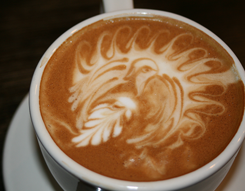 When the cup is almost full, pour and lift the stream of frothed cream through the center of the circle.
